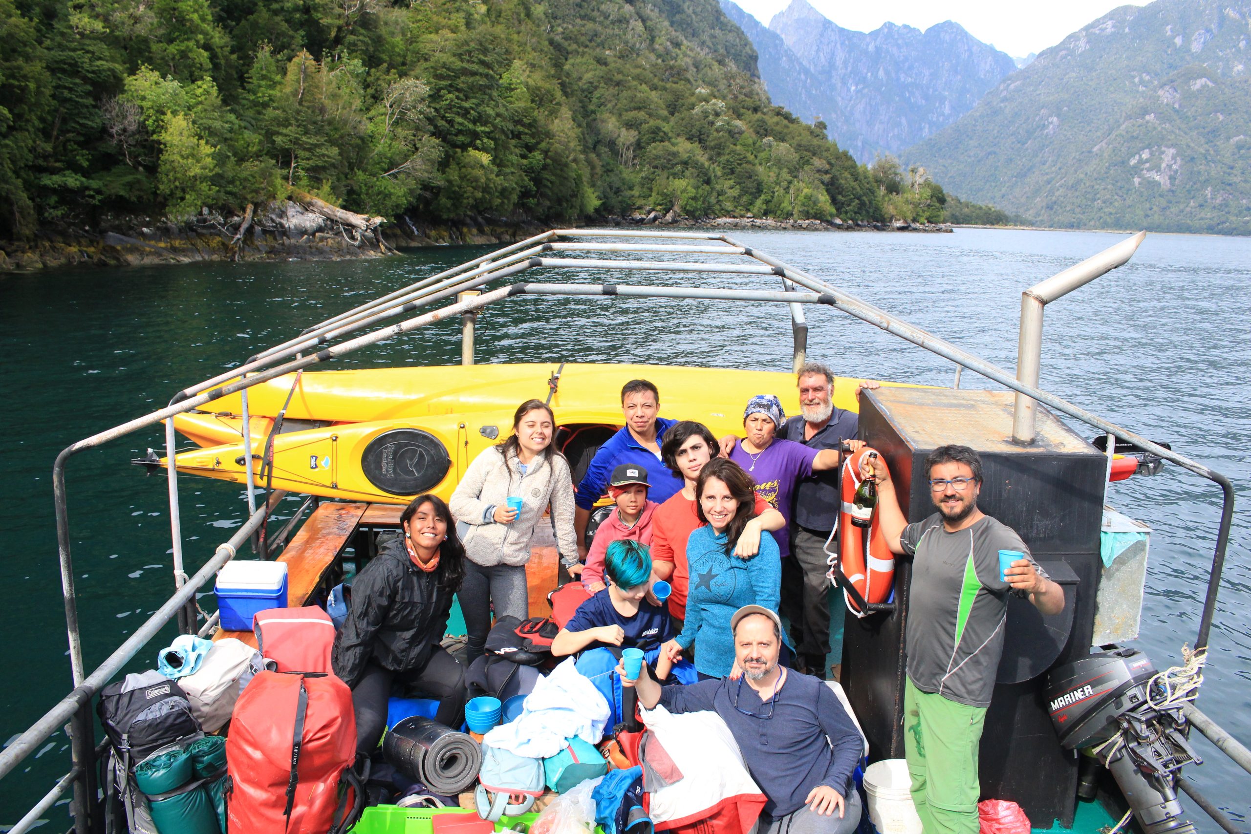 Salida desde Hornopirén en lancha a través del Canal Cholgo rumbo a la rampa de Pichanco, en este lugar prepararemos los kayak para seguir remando rumbo a las termas de Cahuelmo.